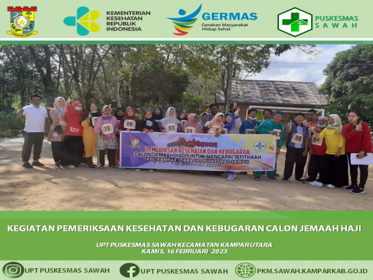 Sawah, 16 Februari 2023 - Calon jemaah haji dari kecamatan Kampar Utara melakukan pemeriksaan kesehatan dan kebugaran di UPT Puskesmas Sawah pada hari ini, Kamis (16/02/2023). Pemeriksaan ini dilakukan sebagai bagian dari persiapan menjelang keberangkatan para jemaah haji ke Tanah Suci.